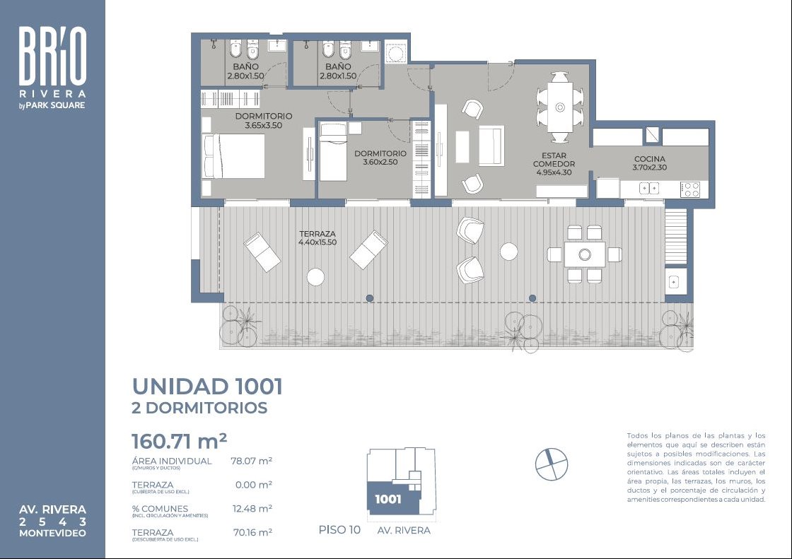 VENTA EN BARRIO POCITOS, ¡OPORTUNIDAD DE INVERSIÓN! PENTHOUSE: Apartamento de 2 dormitorios con terraza, ¡INCREÍBLE VISTA!El proyecto se realiza al amparo de la Ley 18.795, Ley de Vivienda Promovida (Vivienda Social) por lo que cuenta con:- Exoneración del ITP.- Exoneración de IRAE/IRPF a las rentas generadas de los alquileres por 10 años.- Exoneración del ITP por 10 años.SERVICIOS Y CARACTERÍSTICAS:• Barbacoa con terraza 360° y vista al skyline de la ciudad.- La barbacoa del último piso fue pensada para pasar buenos momentos. El ambiente se abre totalmente al exterior con ventanales piso techo y se funde con la vista al skyline de la ciudad. Un espacio dentro de tu edificio para disfrutar con invitados, organizar una reunión de trabajo o simplemente para estar a solas en paz.• Gym con terraza 360° y vista al skyline de la ciudad.- La vista desde el gimnasio es un gran incentivo para que subas a ejercitarte. Y para los fans del entrenamiento al aire libre, cuenta con 65 m de circuito aeróbico por la terraza 360º sin tener que salir del edificio.• El hall de acceso con su rica paleta de materiales, texturas y una cuidada iluminación, es prueba de que el diseño está presente en cada rincón del edificio.• Es ECO Friendly: Incluye bicicletero.• Garages disponibles.• Laundry con app.EQUIPAMIENTO:• Aire acondicionado en estar y dormitorios.• Cocinas con mesadas de granito o similar y pileta de acero inoxidable.• Anafe, horno y termofón instalados.• Placares bajo y sobre mesada de cocina.• Grandes aberturas de aluminio anodizado color, línea Gala o similar.• Pisos de porcelanato en cocinas y baños.• Sanitarios con grifería mono-comando de primera calidad.- Honorarios inmobiliarios del 3% + IVA.+ Info: 092500292 / 099699843¡No se pierda esta excelente oportunidad de inversión! ProyectoBrío es tu lugar en la ciudad. Es un proyecto que se suma a la vida urbana con apartamentos de 1 y 2 dormitorios, en donde la calidad y el confort fueron las premisas a la hora de planificar las tipologías. Su ubicación es incomparable en términos de comodidad y accesibilidad, ya que se ubica sobre uno de los principales conectores este-oeste, justo en el límite entre Parque Batlle y Pocitos, a pocas cuadras de uno de los pulmones verdes de la ciudad, ideal para salir a oxigenarse. Vivir en medio de un universo de servicios y entretenimiento es una gran ventaja para poder resolver casi todo caminando, ganar tiempo y mantenerte activo. Las vistas 360° al skyline de Montevideo se pueden disfrutar al subir al piso 11, desde la barbacoa o mientras te ejercitás en el gimnasio. Disfrutá de Brío y sus comodísimos garages y amenities polivalentes. ¡No te lo pierdas!Servicios• Barbacoa con terraza 360° y vista al skyline de la ciudad.• Gym con terraza 360° y vista al skyline de la ciudad.• Es ECO Friendly: Incluye bicicletero.• Garages disponibles.• Laundry con app.Financiación- 30% en la PROMESA. - 20% a los 90 días de la PROMESA.- 40% en 4 CUOTAS.A partir de ABRIL 2026: - Saldo del 10% restante al momento de POSESIÓN.VIS Vivienda de Interes SocialEntrega Abril/2026