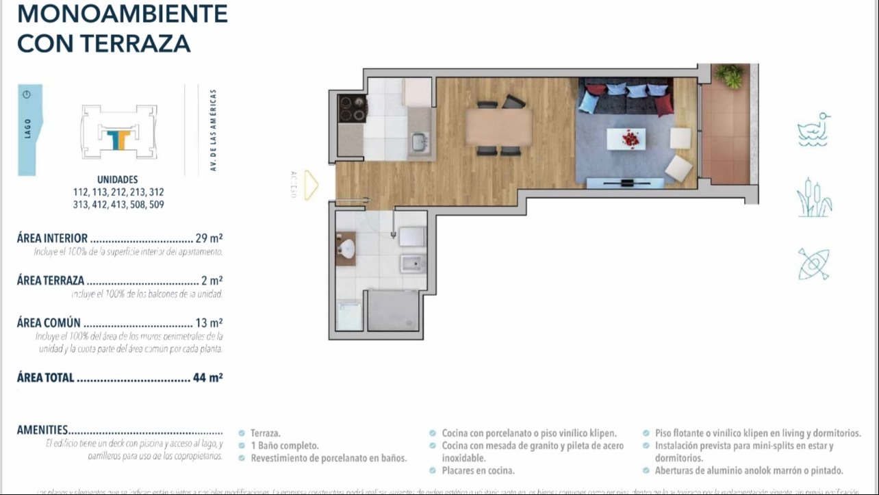 ALQUILER de MONOAMBIENTE AMUEBLADO con cochera Edificio AMERICAS UNOCuenta con deck con piscina y acceso al lago, y parrilleros para uso de los copropietariosTerraza y baño completo.Cocina con mesada de granito y pileta de acero inoxidable y placares.Aberturas de aluminio anolok.Consulte por opción sin amueblarCoordine visitas,Natalia Urretavizcaya Cel 099 195 441Entre Lagos Bienes Raices es socio de Cámara de Inmuebles de Canelones y de ADIU.